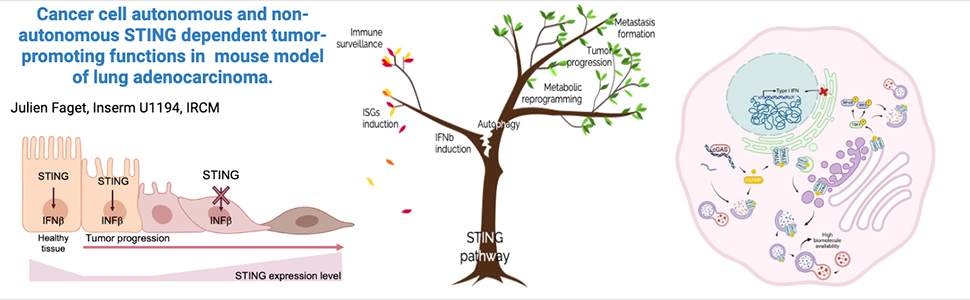 Triggering STING (Stimulator of Interferon Genes) pathway, an innate immune sensor, is considered a possible therapeutic option in lung cancer. Indeed, in tumor infiltrating myeloid cells, canonical Sting signaling, induces a potent type-I interferon (IFN) signaling, orchestrating robust immune responses. However, Sting’s role in cancer cells is complex and context dependent, being associated to tumor growth in some cancer models. Our research used the KrasLSL-G12D/WT;p53fl/fl (KP) mouse model to explore STING biology in lung cancer cells.