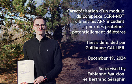 Son travail dirigé par Fabienne Mauxion et Bertrand Séraphin est intitulé : Caractérisation d'un module du complexe CCR4-NOT ciblant les ARNm codant…