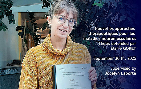 Her work, supervised by Dr. Jocelyn Laporte, is entitled "New Therapeutic Approaches for Neuromuscular Diseases."