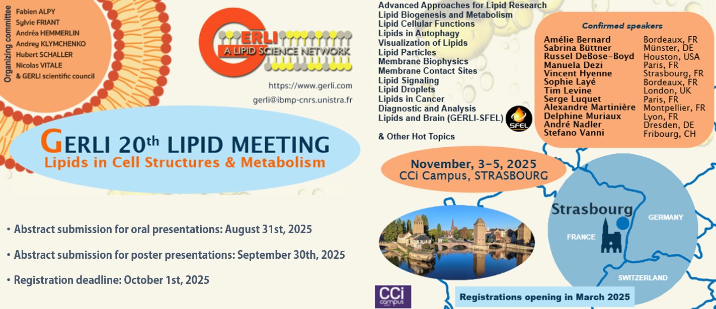 La 20ᵉ GERLI International Lipid Meeting se tiendra à Strasbourg du lundi 3 novembre au mercredi 5 novembre 2025, au centre de conférences du campus CCI Alsace.